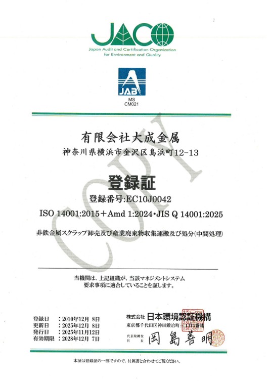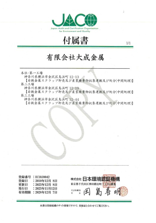 有限会社 大成金属は、金属原料と産業廃棄物を取り扱う 『リサイクル』を考える 『リサイクル』とは、現在だけでなく未来の地球環境にも直結する重大かつ深刻なテーマの1つ。 創業より半世紀、『リサイクル』一筋に生きてきた我々には、その実績とノウハウを応用・活用する力があります。 また、そこに新たなリサイクル方法と、更なる産業廃棄物の軽減化を貪欲に求めてゆく若き力も加わりました。 この2つの力を融合させ、あるべき資源循環型社会の構築を目指し、日々全力で取り組んでおります。 |